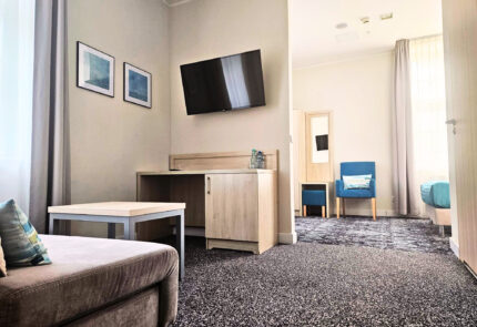 Das Familienzimmer mit einer Größe von 29–32 m² ist eine komfortable Wahl für 3 Gäste oder für Familien mit 2 Erwachsenen und 2 Kindern. Das Zimmer wurde so gestaltet, dass es während des Aufenthalts mehr Bewegungsfreiheit bietet – mit einem klar abgetrennten Schlafbereich und einem Wohnbereich mit einem Schlafsofa von 140 cm Breite. Im Schlafbereich steht je nach Wunsch der Gäste entweder ein 140 cm breites Doppelbett oder zwei separate Einzelbetten mit einer Breite von jeweils 90 cm zur Verfügung. Die funktionale Raumaufteilung sorgt für einen angenehmen Aufenthalt für die ganze Familie – sowohl bei kürzeren Reisen als auch bei einem längeren Urlaub am Meer.